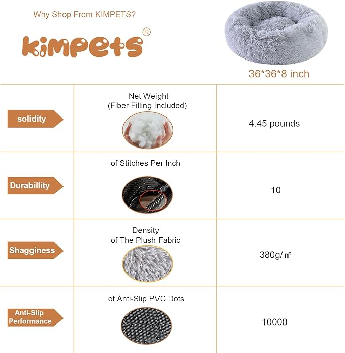 - MUTIPLE SIZE - Pick the perfect size for your pup! Large size of dog donut bed is( 36'' x 36'' x 8”) and up to 92lbs, like Keeshonden, Staffordshire Bull Terriers, Dachshunds, Whippets.Kimpets dog beds available in 16'', 20'', 24'', 28'', 32'' and 38'' . WARMMING: Our cozy dog bed not suitable for puppy with excessive teething or chewing behavior!