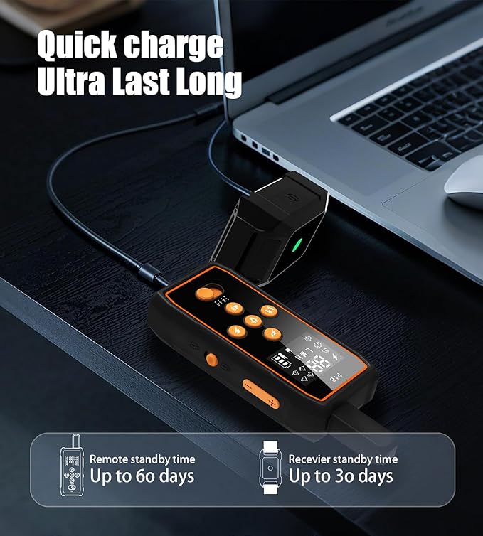 - đ©ăIncredible Battery Life & Quick Chargingă The collar features USB charging with a 2-in-1 fast charging design that takes just 2 hours to fully charge. It offers long-lasting battery life, with up to 30 days of standby time for the collar and 60 days for the remote, reducing the need for frequent recharges
