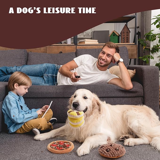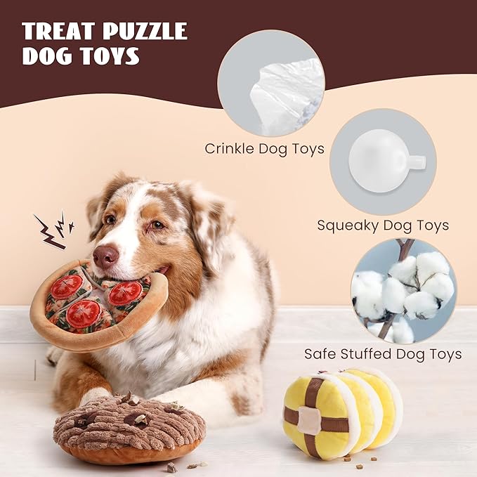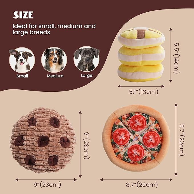 - Funny and Cute Design: This interactive dog toy features three charming food shapes— Tomato Pizza, Chocolate Cookies, and Butter Muffins. Each cute dog toy features vibrant simulation effect, offering dogs a unique interactive encounter.
