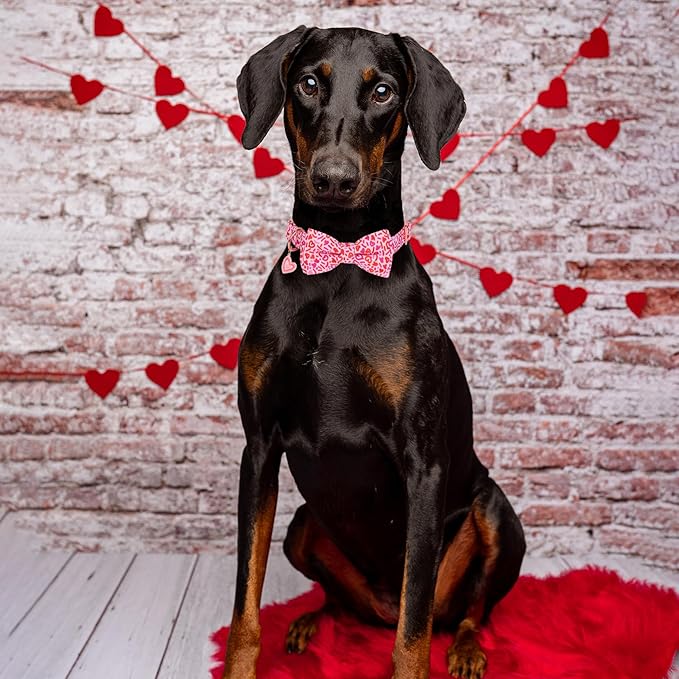 - Valentine's Day Dog Collar with Bowtie: Designed with pink color, adorable heart pattern, make your dog attractive during valentine day. Holiday dog bow is attached to collar using an elastic strap, it is detachable. Adorable heart charm make this collar more fashion.