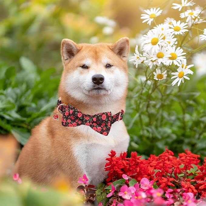 - Floral Dog Collar with Bowtie: Designed with lovely red rose pattern, make your dog attractive when wearing. Flower dog bow is attached to collar using an elastic strap, it is detachable. Adorable rose charm make this collar more fashion.
