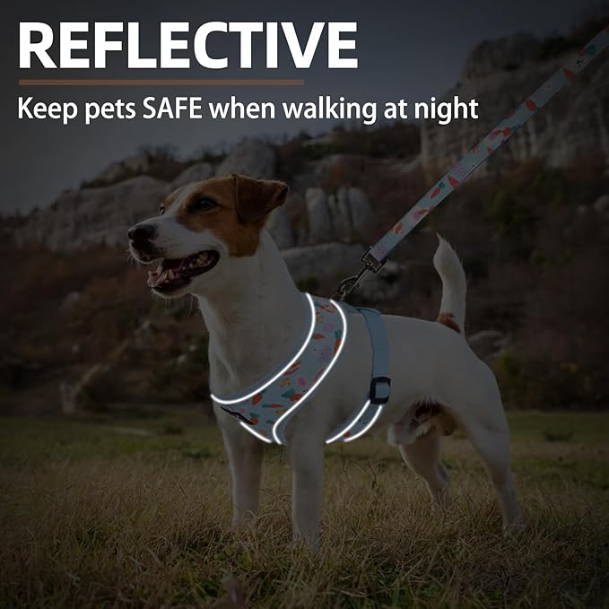 - ALL DAY & ALL SEASONS WEARING: This harness leash set is very lightweight, soft, and breathable, even after a full day of wear, it won't make your dog feel uncomfortable and will still stay active. Besides, the harness fits four seasons wearing, keeps the dog cool in summer, and it offers warmth to your dog in winter, in the harness outside you can give the dog to wear another piece of clothing is also possible