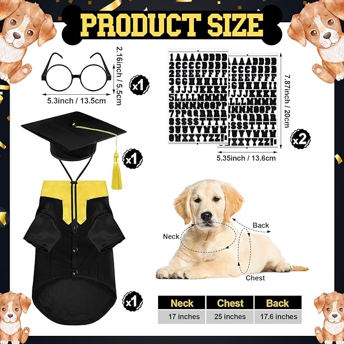 - Ideal Size: the neck size of our pet graduation gown is about 17 inches, chest size is about 25 inches, back size is about 17.6 inches, ideal for about 19.8-33 Lb pets; The glasses size is about 5.3 x 2.2 inches; The letter stickers is about 5.35 x 7.8 inches; It's suggested that the pet's sizes need to be measured before selecting this dog graduation hats accessory costume