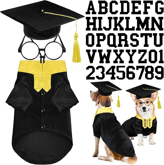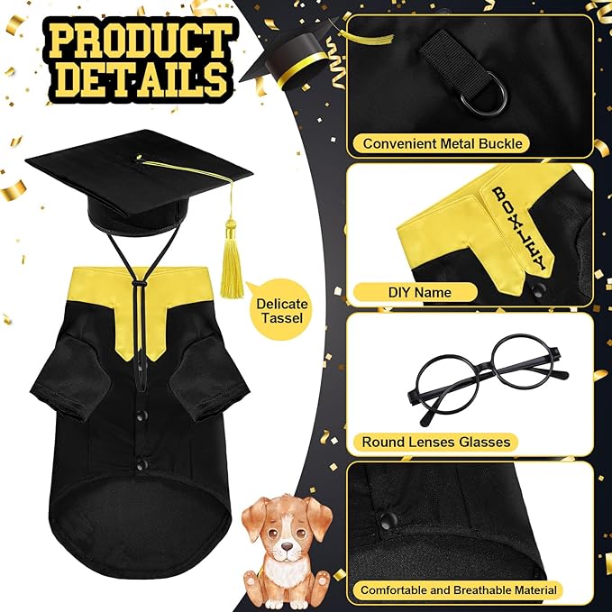 - Package includes: you will receive a black pet graduation gown with yellow stole, a black dog graduation hat with a yellow tassel, a pair of round lenses glasses and 2 DIY name letter stickers, the gown has a metal buckle on the back for easy use; A complete set of clothing accessories to make your pet the focus of the graduation party