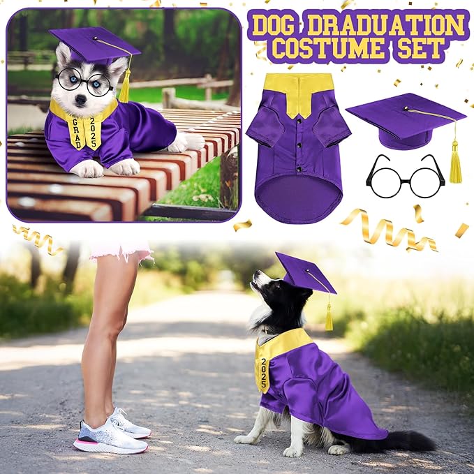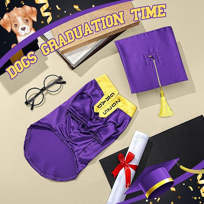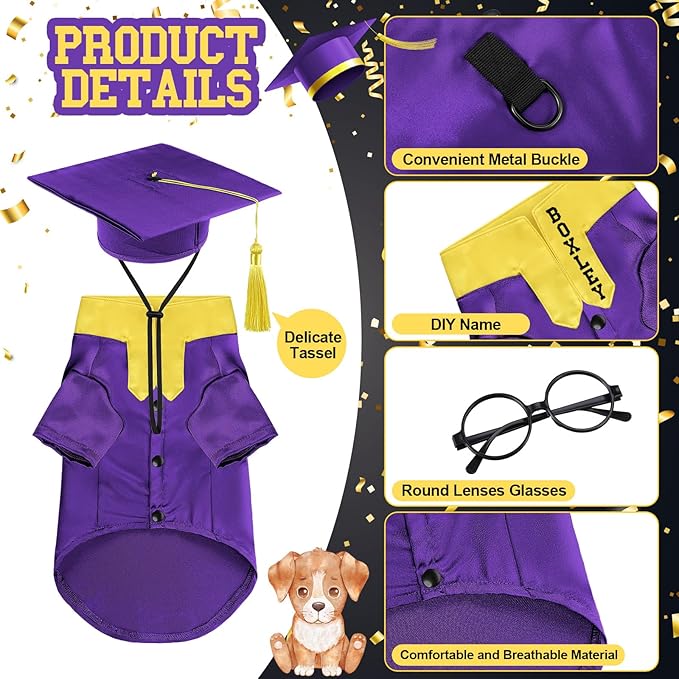 - Package includes: you will receive a purple pet graduation gown with yellow stole, a purple dog graduation hat with a purple tassel, a pair of round lenses glasses and 2 DIY name letter stickers, the gown has a metal buckle on the back for easy use; A complete set of clothing accessories to make your pet the focus of the graduation party