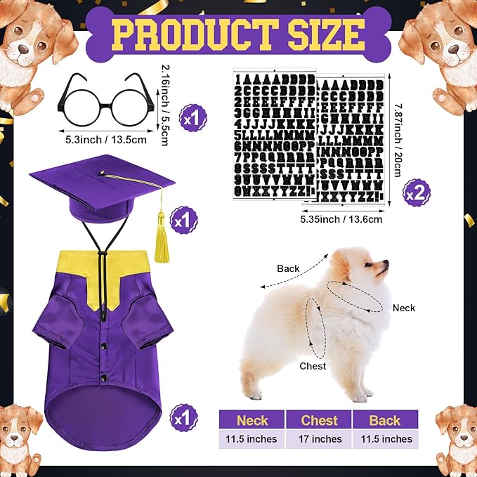 - Ideal Size: the neck size of our pet graduation gown is about 11.5 inches, chest size is about 17 inches, back size is about 11.5 inches, ideal for about below 9.9 Lb pets; The glasses size is about 5.3 x 2.2 inches; The letter stickers is about 5.35 x 7.8 inches; It's suggested that the pet's sizes need to be measured before selecting this dog graduation hats accessory costume