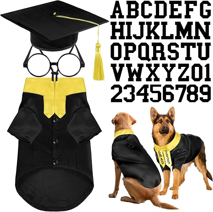 - Package includes: you will receive a black pet graduation gown with yellow stole, a black dog graduation hat with a yellow tassel, a pair of round lenses glasses and 2 DIY name letter stickers, the gown has a metal buckle on the back for easy use; A complete set of clothing accessories to make your pet the focus of the graduation party