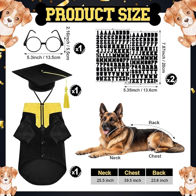 - Ideal Size: the neck size of our pet graduation gown is about 25.5 inches, chest size is about 39.5 inches, back size is about 23.5 inches, ideal for above 55 Lb pets; The glasses size is about 5.3 x 2.2 inches; The letter stickers is about 5.35 x 7.8 inches; It's suggested that the pet's sizes need to be measured before selecting this dog graduation hats accessory costume
