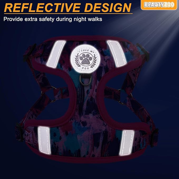 - Reflective & Daily Walking: This dog harness has 4 sides of reflective straps, and the middle logo also is reflective, so when you walk with your dog at night, then both of you will be safer! And the unique print design, will make your dog the most visible presence outdoors in this summer