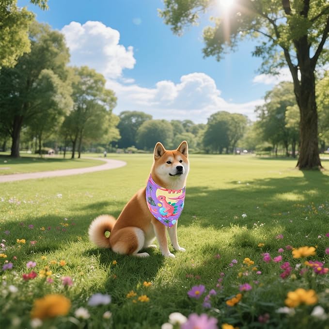 - Dino Dog Bandanas Material:Dogs bandanas scarves are made of 100% durable polyester,machine wash and dry available,soft and comfortable,giving pets a better wearing experience
