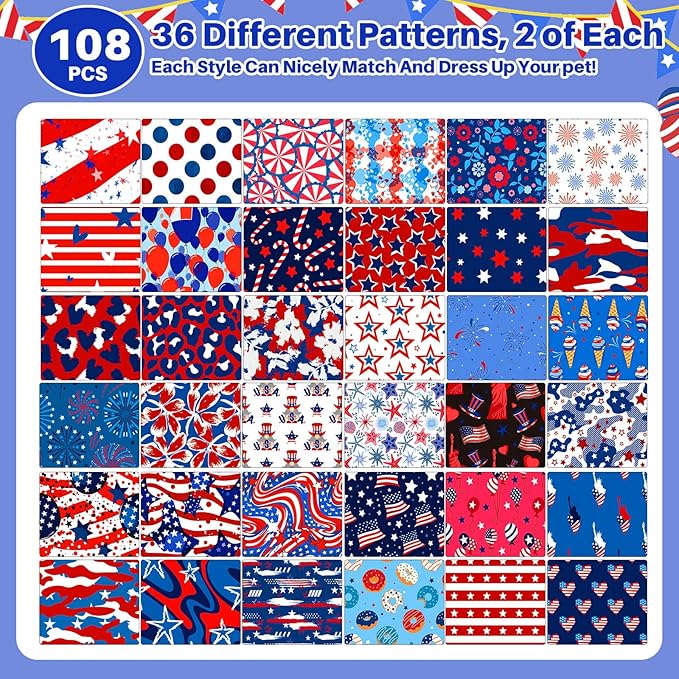 - Abundant Quantity for Every Celebration: this pack includes 108 patriotic bandanas for dogs, with 36 different designs and 3 bandanas per design; Ideal for family gatherings, parades, or as giveaways in bulk for Independence Day dog costume accessories