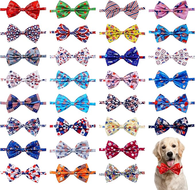 30 PCS 4th of July Dog Bow Ties Bulk for Small Medium Large Dogs Patriotic Dogs Bowties with Adjustable Ties Independence Day Bow Ties Party Grooming L