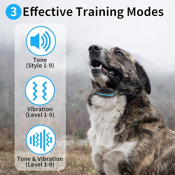 - 【 3 Effective Training Modes 】 Our vibrating dog collar features 3 training modes with adjustable tone(1-9 styles), vibration(1-9 levels), tone & vibration(1-9 levels/styles). Meets different training needs while being safe