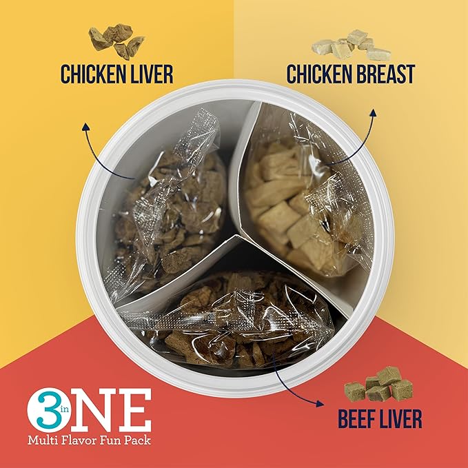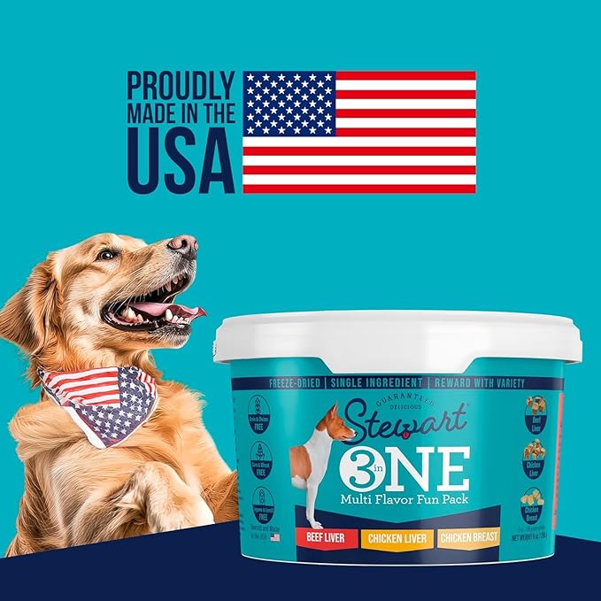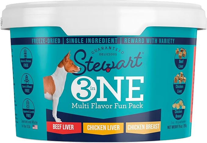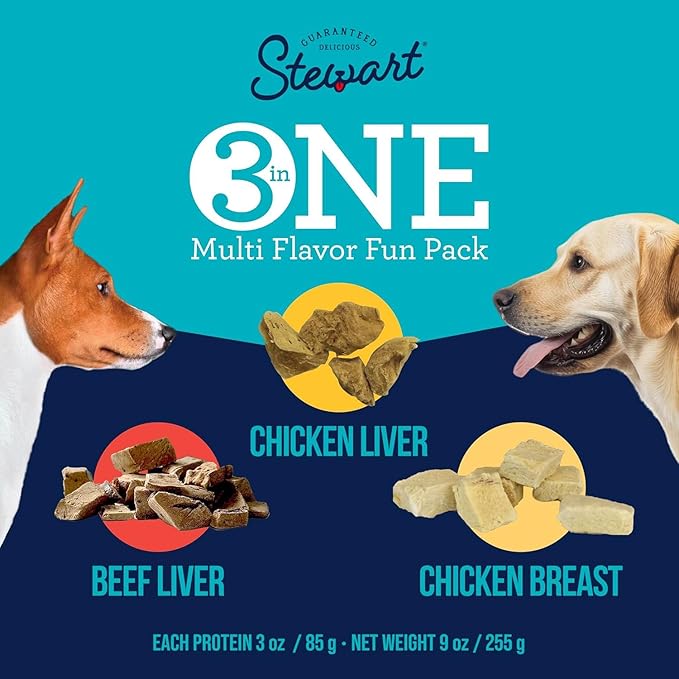 - Includes One 9 oz Resealable Tub with 3 individually wrapped flavors: Beef Liver, Chicken Breast, and Chicken Liver; Stewart dog treats are perfect for training, rewarding, or enhancing your dog’s meals with high-protein, single-ingredient nutrition