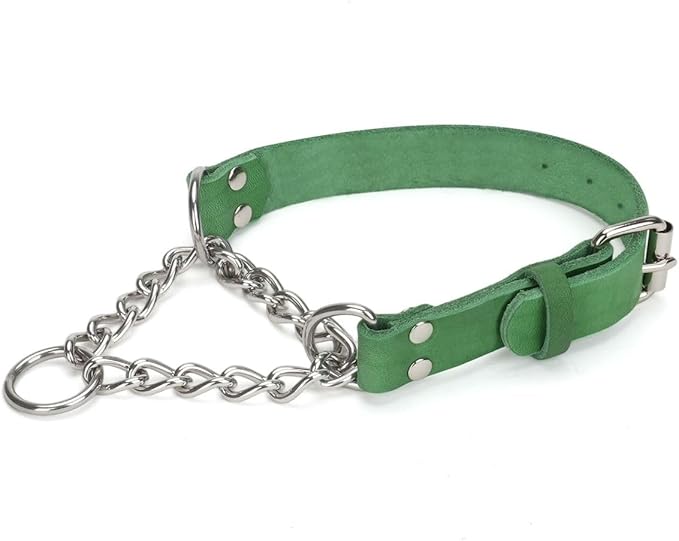 Martingale Collar for Dogs No-Pull Adjustable Training Collar with Stainless Steel Chain - Genuine Leather Anti-Slip Design for Small,Medium,Large Breed Dogs - Green (M)