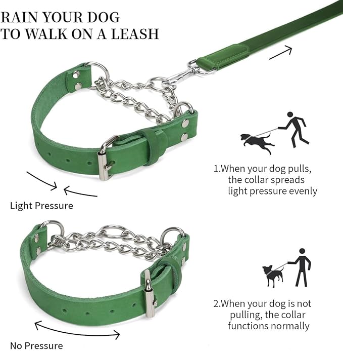 Martingale Collar for Dogs No-Pull Adjustable Training Collar with Stainless Steel Chain - Genuine Leather Anti-Slip Design for Small,Medium,Large Breed Dogs - Green (S)