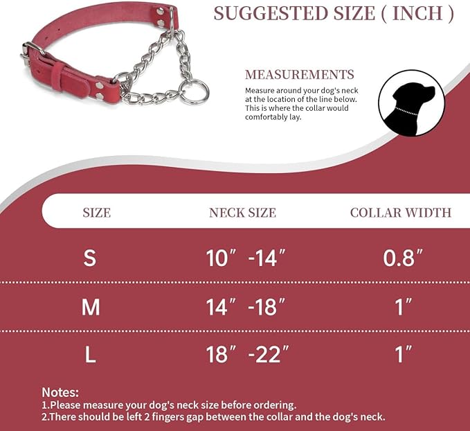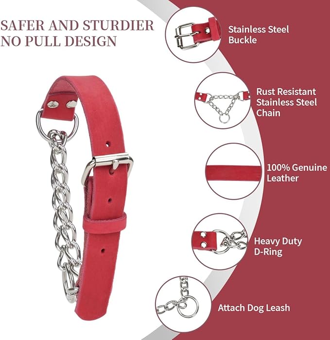 Martingale Collar for Dogs No-Pull Adjustable Training Collar with Stainless Steel Chain - Genuine Leather Anti-Slip Design for Small,Medium,Large Breed Dogs - Red (L)