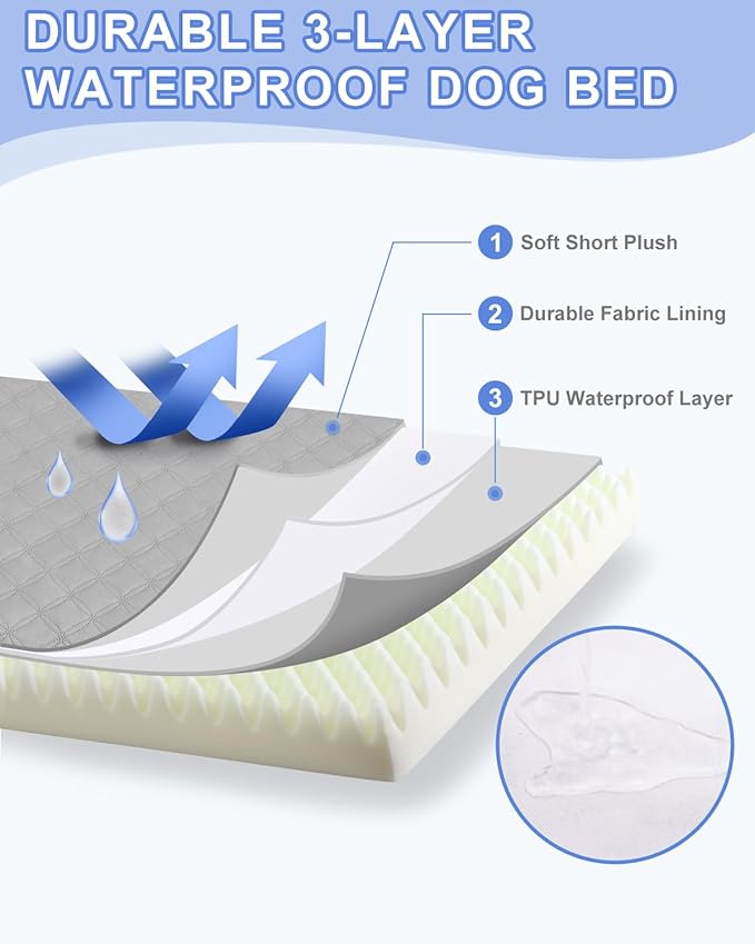 - Ultra-soft Waterproof Fabric: The sleeping area of the waterproof dog bed is made of 3-layer fabric, skin-friendly and durable. The TPU waterproof layer prevents liquid penetration, protects the foam inside and keeps dog bed clean and tidy.