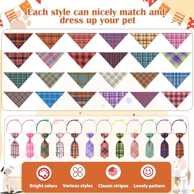 - Sufficient Quantity: the set includes 48 bandanas with 24 designs, 2 of each and 24 dog ties with 12 designs, 2 of each; With vibrant colors and patterns, ample quantities and rich styles can meet your pet daily use and replacement needs; Suitable for decorating cats, dogs, dog models, holiday decoration, festive outfits or daily changes