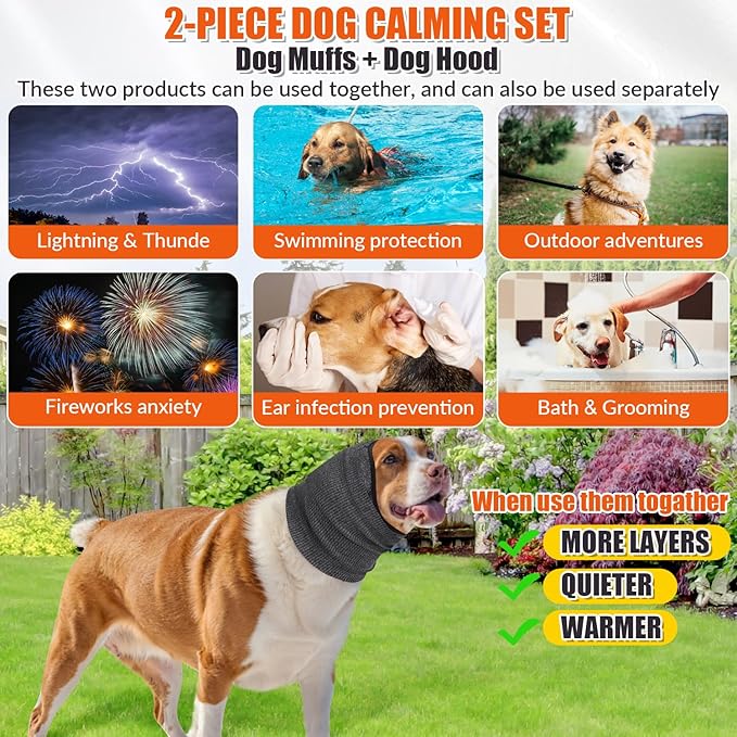 - 【Dog Ear Muffs Noise Protection】--- The dog ear cover blocks loud noises like fireworks or thunderstorms, reducing stress and avoiding scratching that may affect the recovery of the wound. Its full-coverage design also keeps out dirt and debris, promoting ear health of pets. Meanwhile, the neck hood provides gentle pressure to soothe your dog while protecting against wind and cold, creating a calming environment for pets.