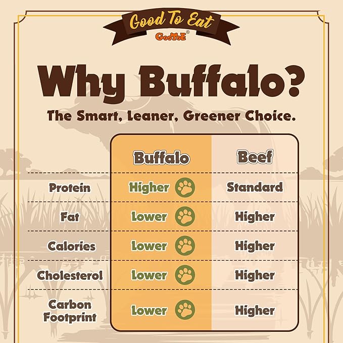 - Healthier & Tastier: Buffalo is a lean protein with less fat and fewer calories than beef, making it a nutritious choice for your dog. Packed with Omega-9 fatty acids, it helps support a shiny coat, healthy skin, and overall well-being.