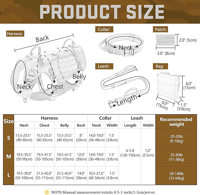 - All-in-One Tactical Bundle for Active Dogs: 1 military-grade dog harness,2 MOLLE backpacks,1 tactical collar,1 shock-absorbing bungee leash and 3 reflective patches.Perfect for hiking,training or urban adventures--store treats,gears in the rugged pouches