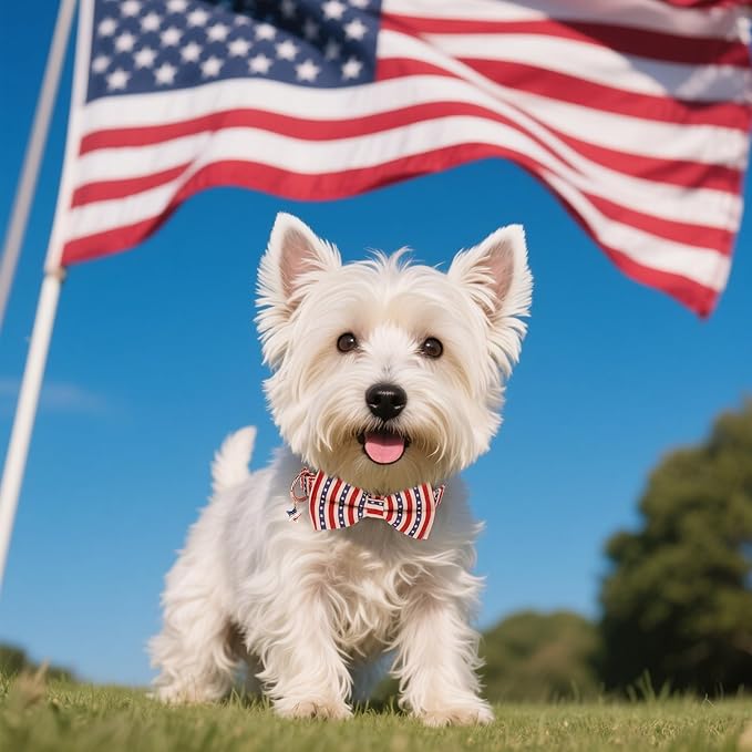 - Vintage American Flag Dog Collar: This patriotic dog collar has the classic red, white, and blue stripes and stars, shows the spirit of Independence Day. The shiny star charm and the removable bow tie make your dog look super cute. It’s great for 4th of July parties, Memorial Day events, or just going for a walk. Your dog will look awesome and stand out anywhere!