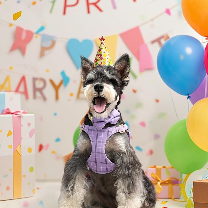 Beirui Cute Small Dog Harness Collar and Leash Set with Bowtie, Soft Adjustable Plaid Puppy Harness for Small Sized Dogs Cats Walks Parties and Photoshoots(Purple,XXS:Chest 12-14")