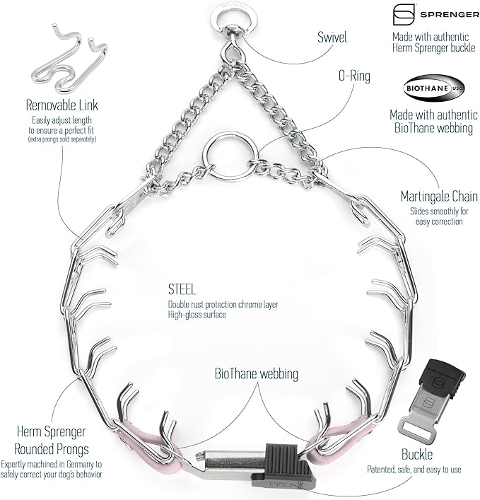 - Herm Sprenger Chrome Plated Steel Prong Collar: This training prong dog collar features a Herm Sprenger Click Lock Buckle, Swivel D-Ring and U.S. made Biothane insert; The Biothane insert enhances the stability and security of the buckle connection with the prongs, while adding a personalized touch with a choice of different colors