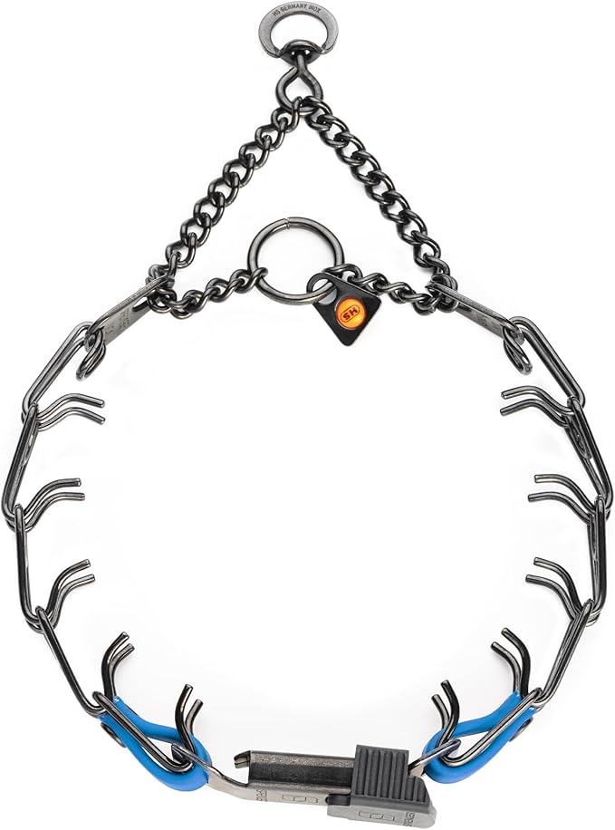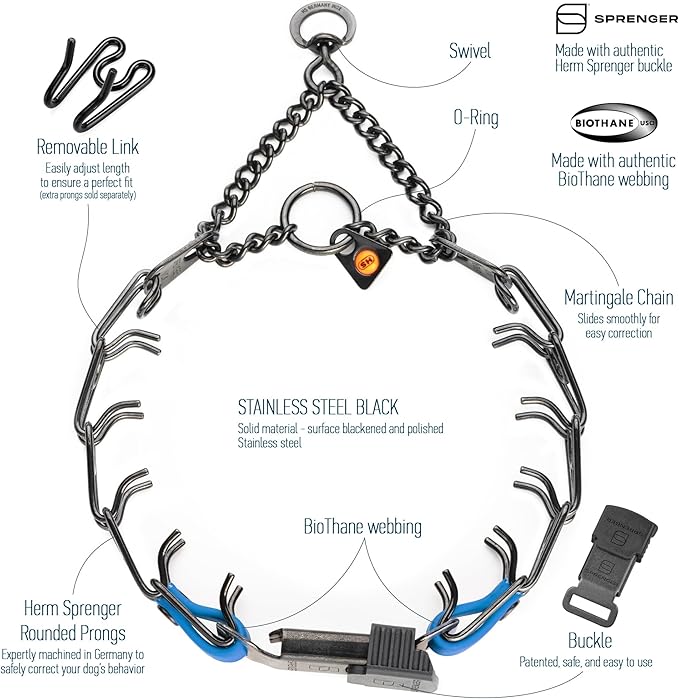 - Herm Sprenger Black Stainless Steel Prong Collar: This training prong dog collar features a Herm Sprenger Click Lock Buckle, Swivel D-Ring and U.S. made Biothane insert; The Biothane insert enhances the stability and security of the buckle connection with the prongs, while adding a personalized touch with a choice of different colors