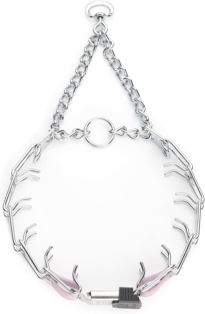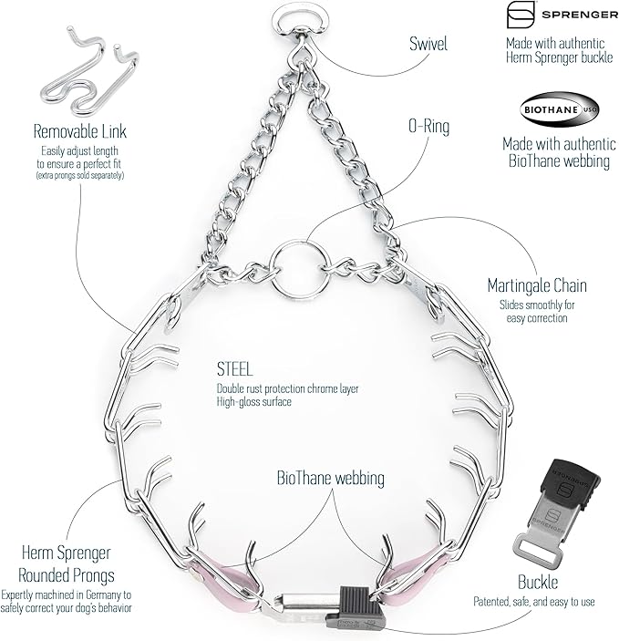 - Herm Sprenger Chrome Plated Steel Prong Collar: This training prong dog collar features a Herm Sprenger Click Lock Buckle, Swivel D-Ring and U.S. made Biothane insert; The Biothane insert enhances the stability and security of the buckle connection with the prongs, while adding a personalized touch with a choice of different colors