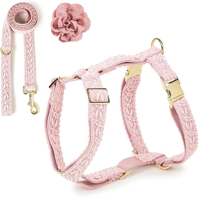 - Pink Dog Harness with Detachable Flowers: This dog leash and harness set girl uses elastic bands to secure the decorative flowers to the dog harness, which can be detached and attached to any dog collar girl. The dog harness & leash set is made from lace cotton handmade fabric and flowers which is very soft and comfortable while the cotton lace texture is smooth and does not fade. It won't hurt the dog.